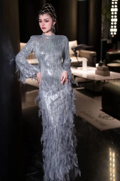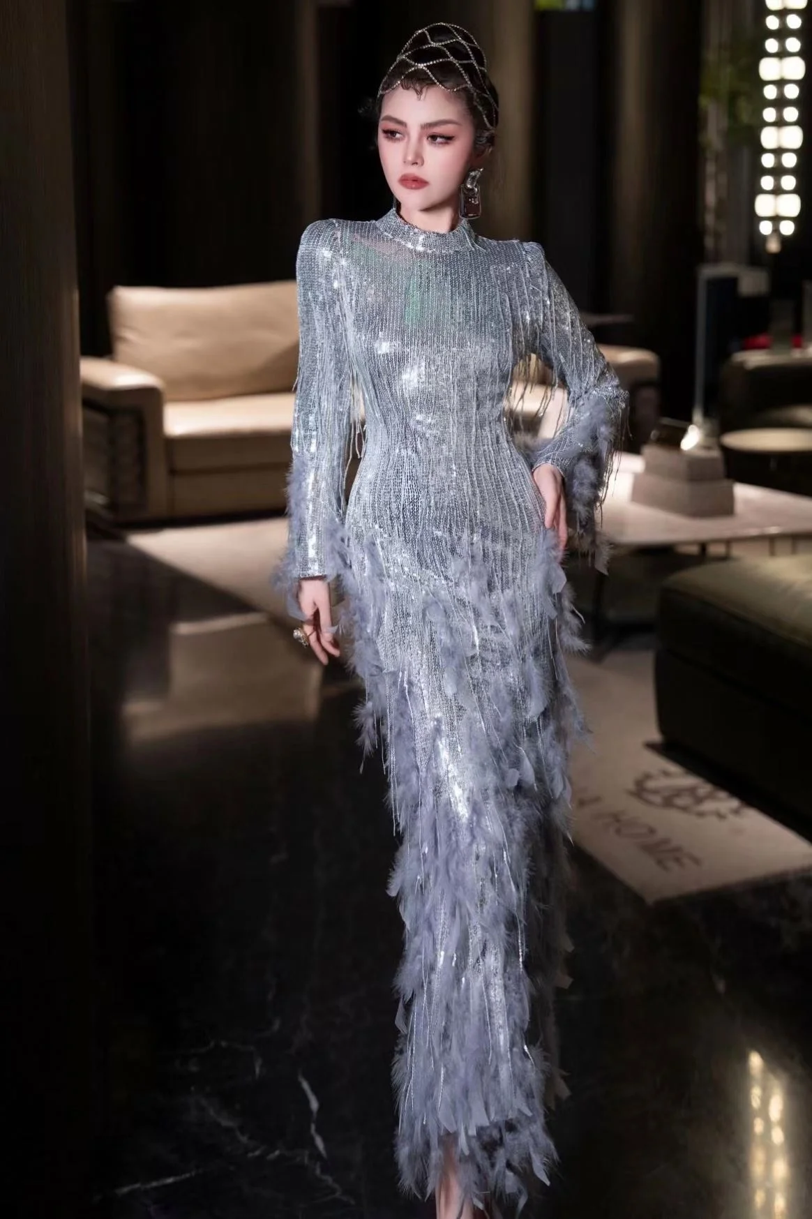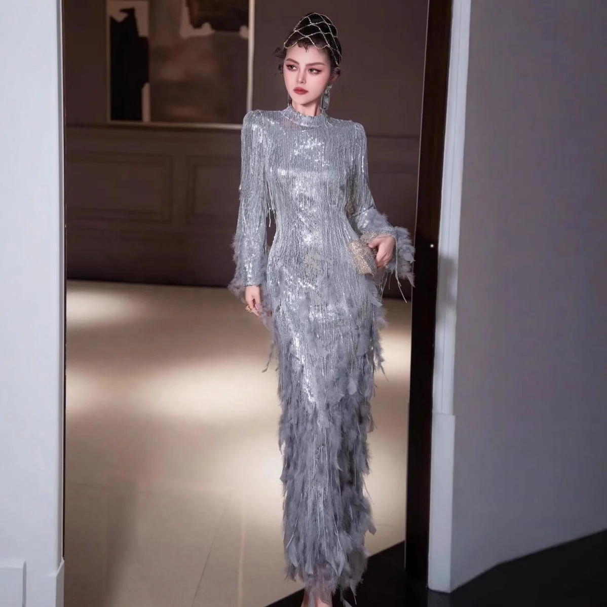 Product Name: YC High Quality Evening Dress Women Spring Summer Sequined Beading Tassel Feather Slim Ceremony Party Banquet Birthday
