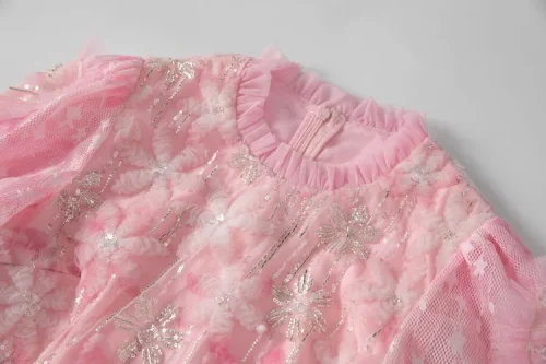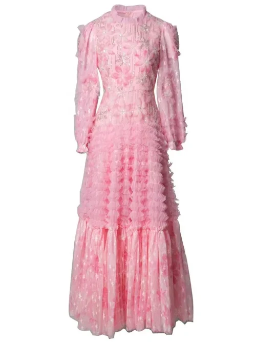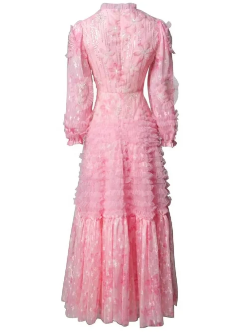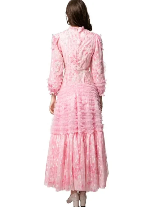 Product Name: YC Lady’s Sequins Beaded Long Dress 2025 Spring O-Neck Stereo Flower Beading Mesh Big Pendulum Women’s Pink Party Dresses