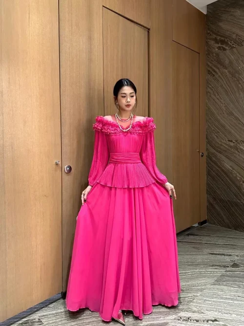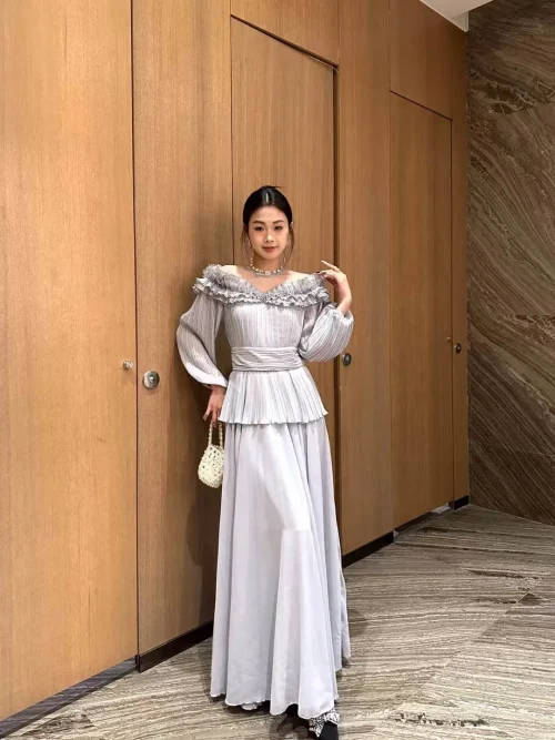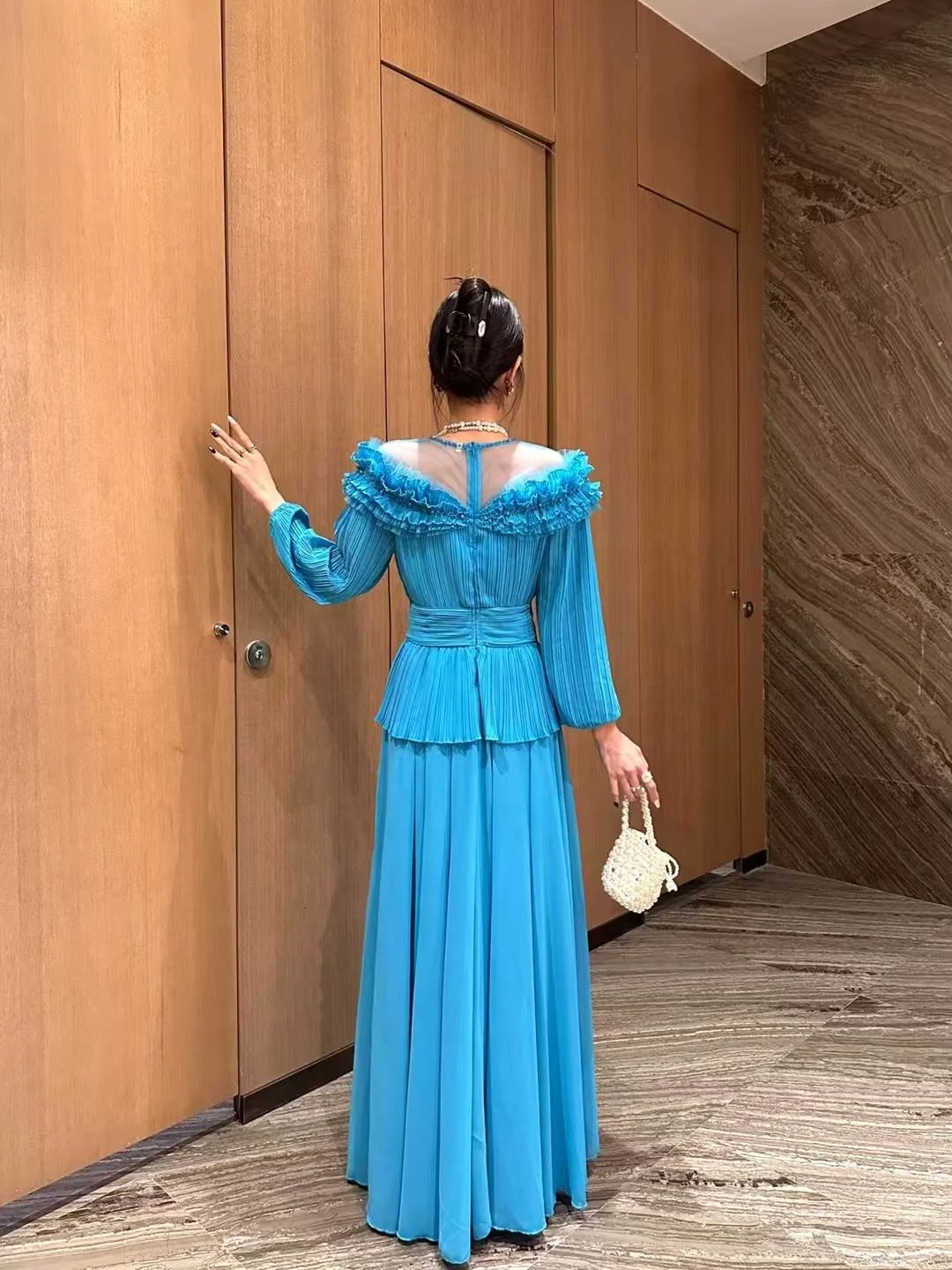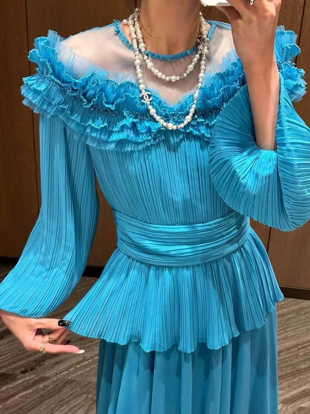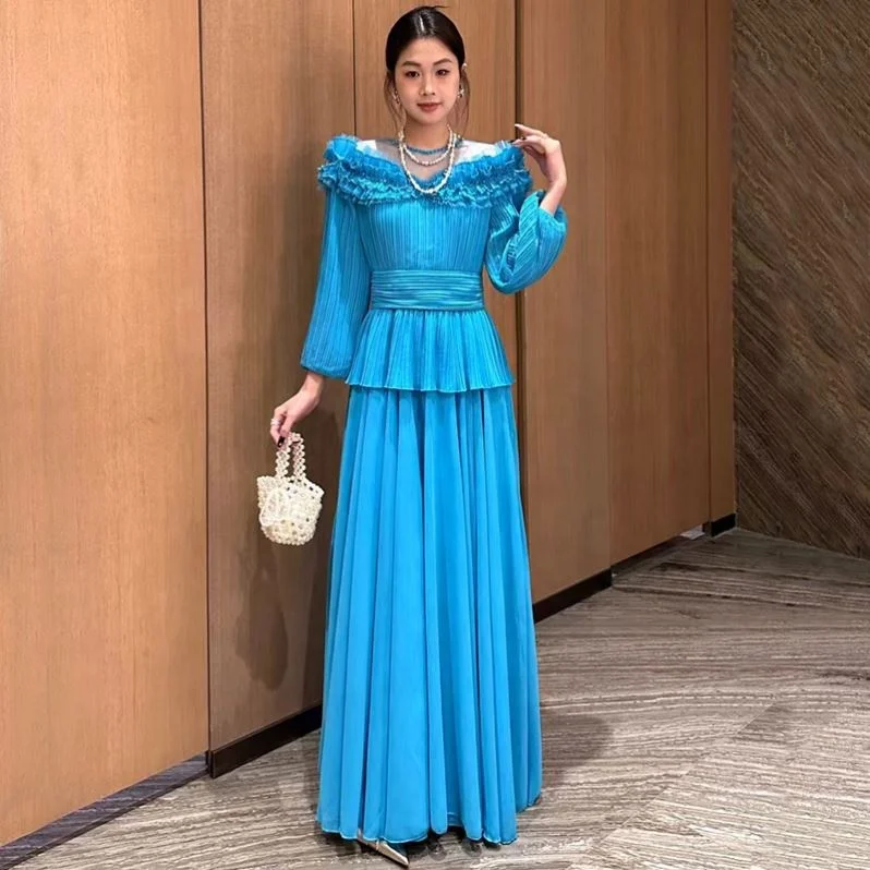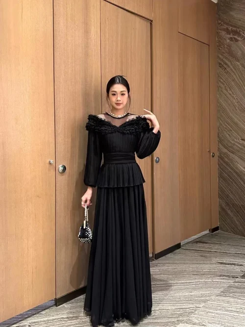 Product Name: YC Women Pleated Full Sleeve Dress Spring Summer Collar Mesh Patchwork See-through Beading Ruffles Layer Long Party