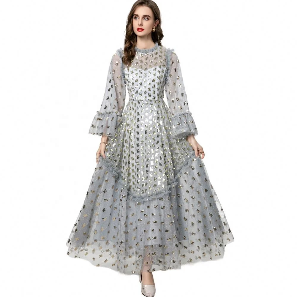 Product Name: YC Women’s O-Neck Flare Sleeve Sequins Embroidery Mesh Purple Ball Gown Long Dresses Fashion Spring New