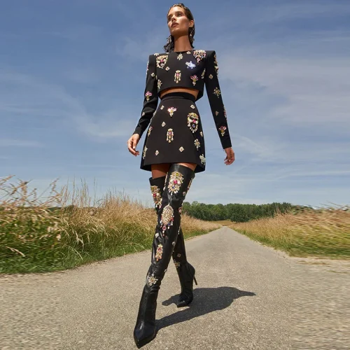 Product Name: ZT1085 Hand-made Beaded Short Blouse and Diamond Skirt Women Two-piece Set