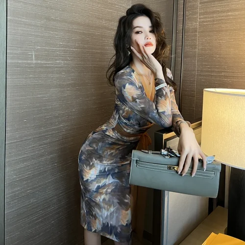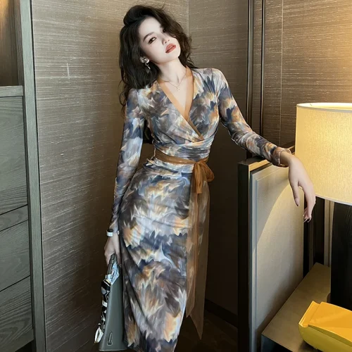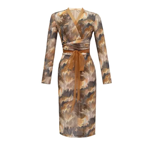 Product Name: ZYHT 10196 Classy Bow V Neck Bodycon Long Sleeve Dress Ruched Waist Mesh Printed Ladies Casual Elegant Draped Dress