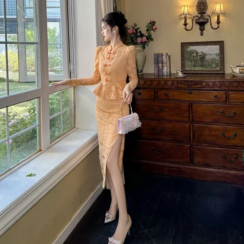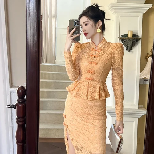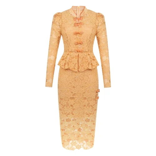 Product Name: ZYHT 11211 2025 Spring New Design Lace Mandarin Collar Hip Wrap Dress Flounce Ruffle Waist Casual Lady Dresses