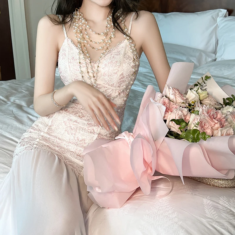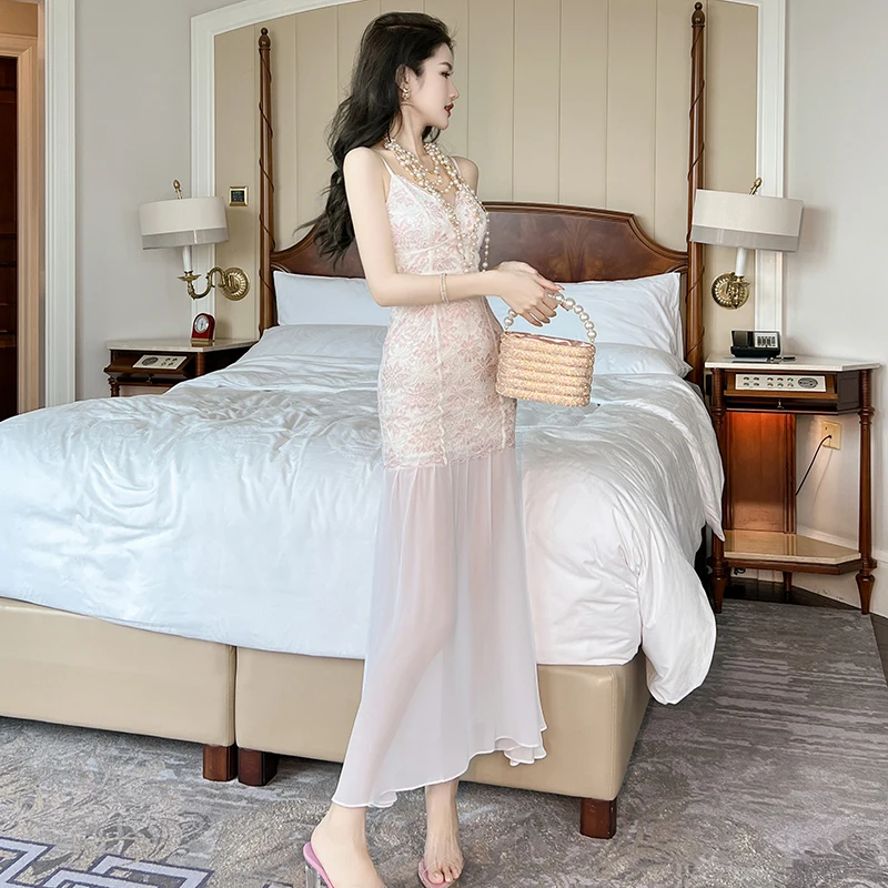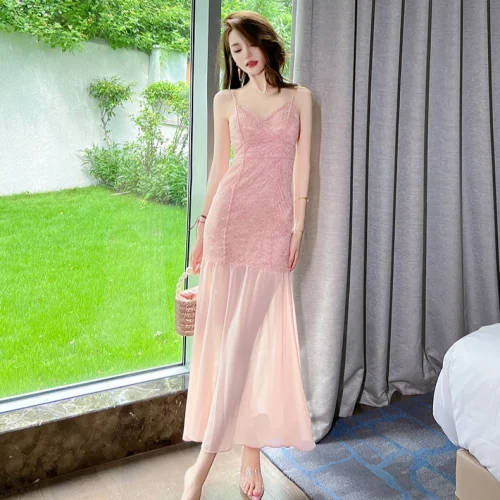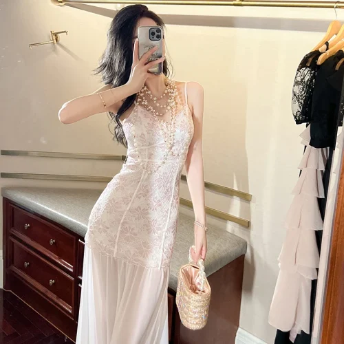 ZYHT 20479 Lady Elegant Floral Embroidery Lace Mesh Stitching See Through Bodycon Sleeveless Spaghetti Strap Sling Sundress