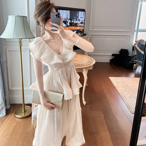 ZYHT 5919 High Quality Yarn Satin V Neck a Line Holiday Party Casual Women Lady Elegant Maxi Dress