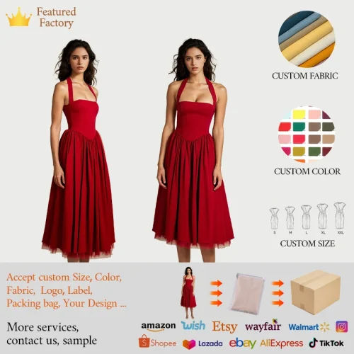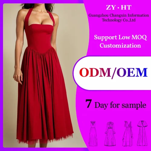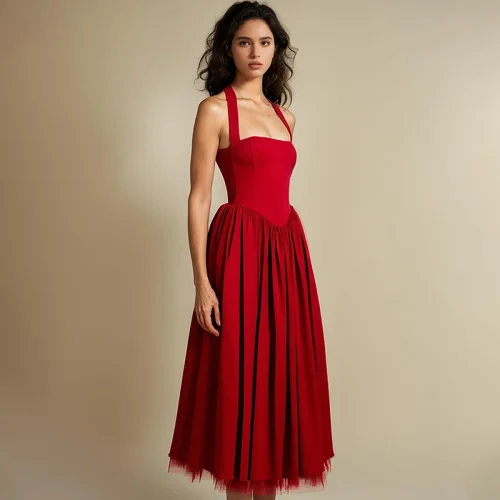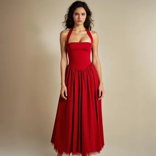 ZYHT 73028 Women’s Summer a Line Bustier Dress for Party Style Halter Empire Waist Pleated Maxi Solid Dress Ladies