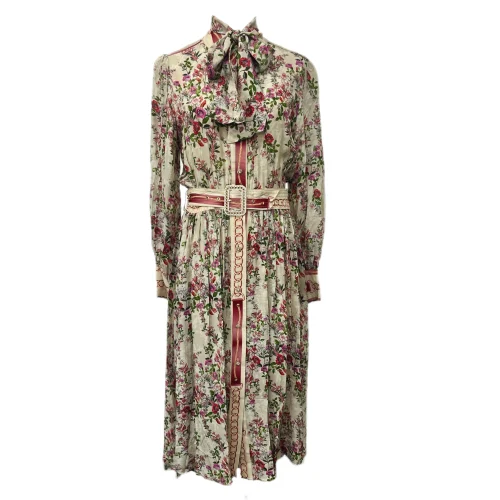 Women’s Vintage Floral Chiffon Dress With Lantern Sleeves Single-Breasted Waist Strap Design Sensing Casual Dress Temperament