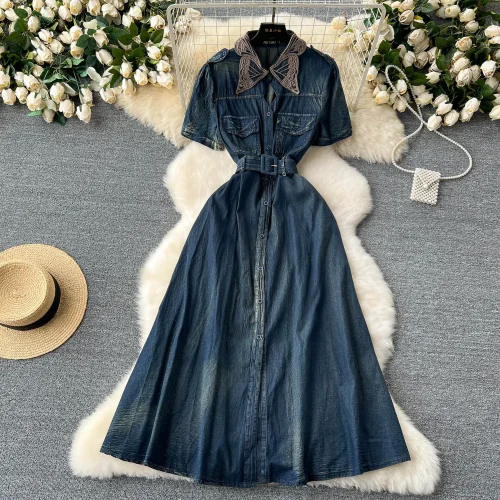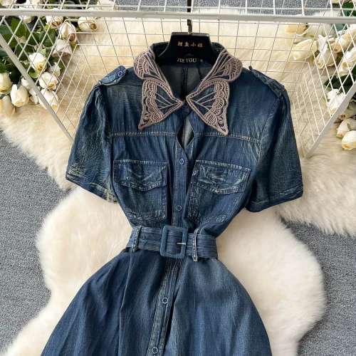 Women’s Vintage Washed Distressed Denim Dress Lace Doll Collar Waist-Cinching Short Sleeve Mid-Length Casual Shirt Summer Front