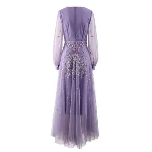 XXL Long Embroidery Dress 2024 Spring Wedding Party Women V-Neck Luxurious Embroidery Sequined Long Sleeve Maxi Dress Purple