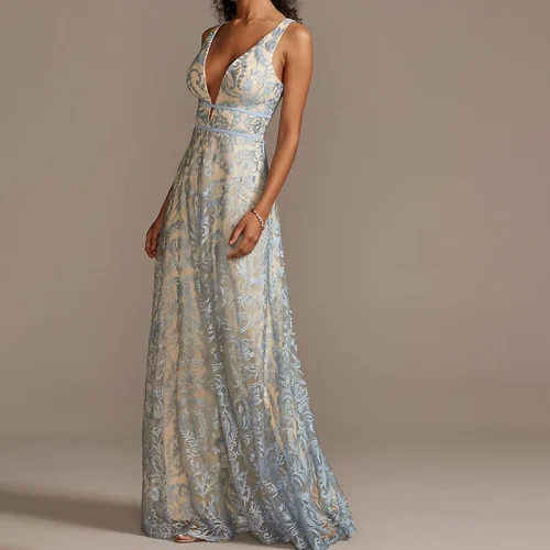 Long Embroidered Mesh A-line Deep V-neck Dress Women Strapless Dinner Dress Evening