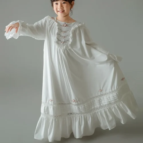Julie 100% Cotton Baby Girl Baptism Christening Wedding Dress-Handcrafted White with Long Sleeves Embroidered Flower O-Necked