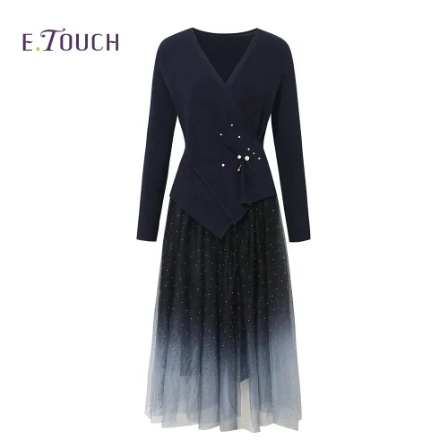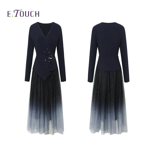 Long Sleeve V-neck Blue Gradient A-Line Dress Summer Simple Mesh High Waist Maxi Dress Ladies Casual Dress