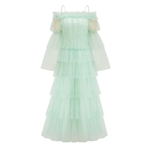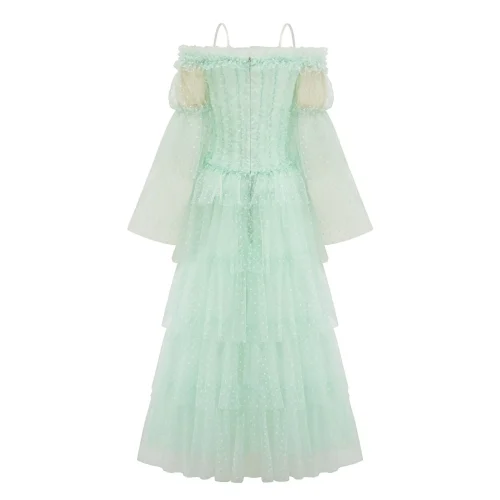 Long Gowns 2025 Spring Fashion Style Women Sexy Slash Neck Polka Dot Print Long Sleeve Tulle Mesh Long Green Party Evening Dress