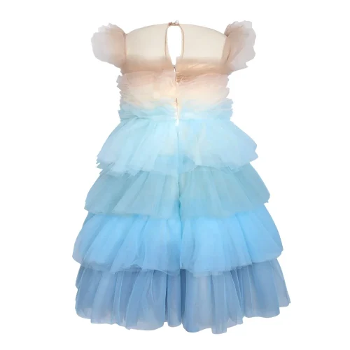 Multilayer 3D Flower Beaded Tulle Dress for Baby Girls Blue Ocean with Short Sleeves Princess Style Muriel Dress for Parties