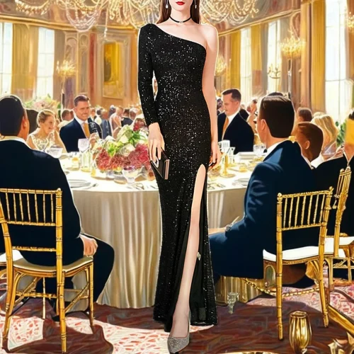 Women’s One-Shoulder Evening Dress Sequined Decoration Floor-Length Sweep Train for Company Annual Meeting Dinner Party Host