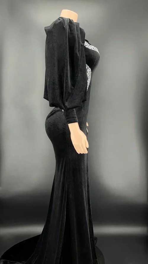 Women’s Sexy Long Black Velvet Evening Dress Rhinestone Chain Chiffon Natural Sequins Ruffles Feathers Pattern for Prom Party