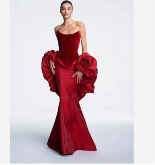 Elegance Red Mermaid Evening Dresses with Rose Flowers Strapless Long Ruffled Floral Formal Dress with Shawl and Prom Gown Cape