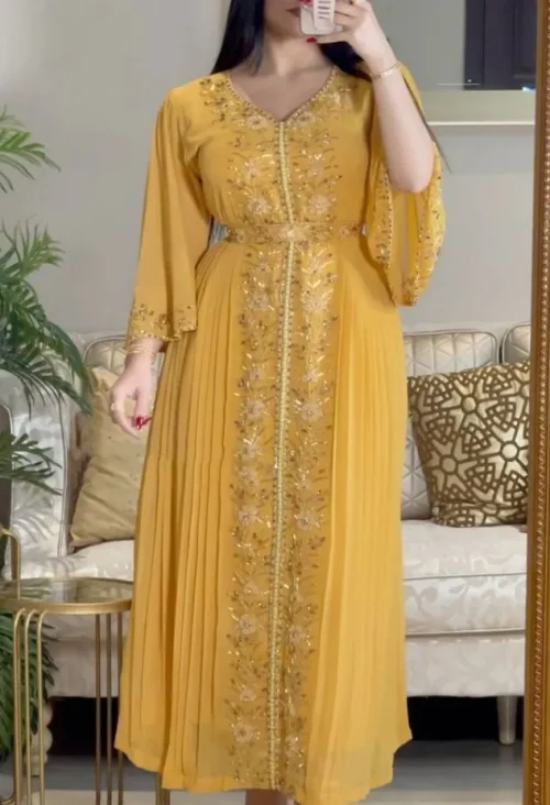 Dubai Yellow Color Rhinestone Embroidery in Middle batwing Sleeve Islamic Girl Evening Party Show Luxury Kaftan for Summer