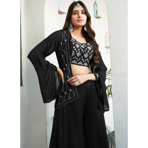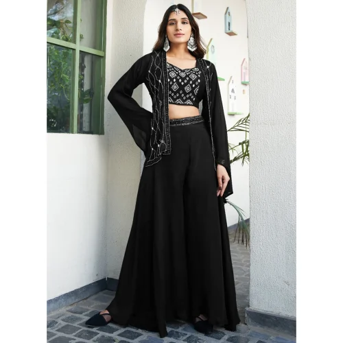 Women’s Indo Western Party Wear Set Black Chinnon with Embroidery Work Ready-to-Wear