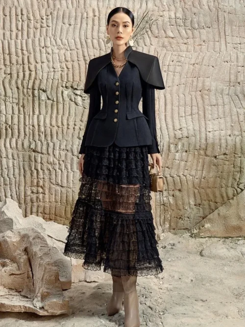 Women’s High Quality Khaki Black Pleated Cake Dress with V-Neck and Shoulder Pad New Arrival Two-Piece Party Jacket Dress Set