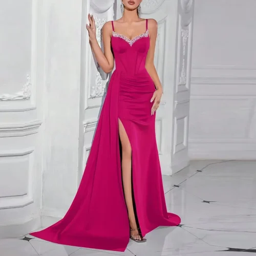 Women’s Heavy-duty Temperament Suspenders Luxury Evening Dresses Nail Diamond Design Long Slit Elegant Party Dress